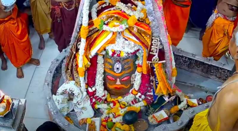 विश्व प्रसिद्ध श्री महाकालेश्वर मंदिर में आज वैशाख कृष्ण पक्ष की सप्तमी तिथि शनिवार सुबह भस्म आरती के दौरान चार बजे मंदिर के पट खुलते ही पंडे पुजारियों ने गर्भगृह में स्थापित सभी भगवान की प्रतिमाओं का पूजन कर भगवान महाकाल का जलाभिषेक दूध, दही, घी, शक्कर फलों के रस से बने पंचामृत को अर्पित कर किया। इसके बाद प्रथम घंटाल बजाकर हरि ओम का जल अर्पित किया। कपूर आरती के बाद बाबा महाकाल को चांदी का मुकुट और रुद्राक्ष की माला धारण करवाई गई।