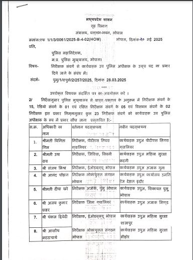 मध्य प्रदेश के गृह विभाग ने पुलिस इंस्पेक्टर्स से उप पुलिस अधीक्षक (कार्यवाहक) बनाये गए 23 पुलिस अधिकारियों की पदस्थापना के आदेश जारी किये हैं, इसमें निरीक्षक संवर्ग के 15 , रेडियो संवर्ग का 1, रक्षित नरीक्षक संवर्ग के पांच, एसएएफ संवर्ग के 2 अधिकारी शामिल हैं जिनका प्रमोशन उपरांत पदस्थापना आदेश जारी हुआ है।