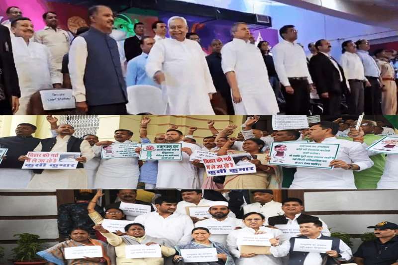पटना: बिहार में मुख्यमंत्री द्वारा राष्ट्रगान के कथित अपमान को लेकर बवाल मचा हुआ है. सड़क से लेकर सदन तक विपक्षी नेताओं ने इसे मुद्दा बनाया और सीएम से माफी मांगने को कहा. इसको लेकर बिहार विधानसभा के दोनों सदनों में विपक्ष ने जमकर हंगामा किया. विपक्ष के विरोध को देखते हुए दोनों सदनों की कार्यवाही दो बजे तक के लिए स्थगित कर दी गई. विधानसभा में नेता प्रतिपक्ष तेजस्वी यादव ने मुख्यमंत्री नीतीश कुमार को लेकर कहा कि कल खेल मैदान में राष्ट्रगान के दौरान उन्होंने जो हरकत की, उससे देश का अपमान हुआ है। सरकार को इस पर जवाब देना चाहिए।