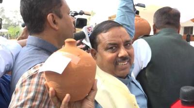 विधानसभा के बाहर खाली गुल्लक के साथ विपक्ष का प्रदर्शन